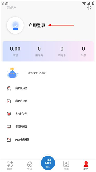 1、打開億通行應用,在乘車界面點擊底部我的選項,進入個人中心頁面,準備進行登錄操作。