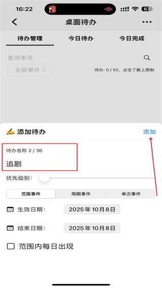 3、在下方彈出的頁面內(nèi),輸入待辦名稱,再點擊添加的按鈕。