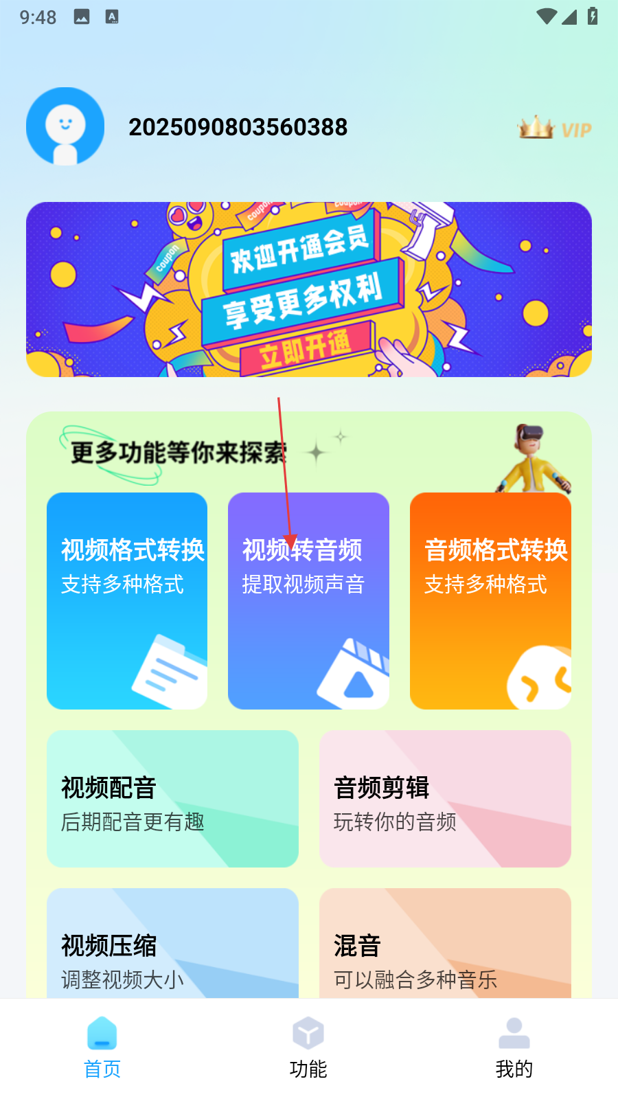 1、打開(kāi)格式轉(zhuǎn)換器應(yīng)用,在首頁(yè)找到視頻轉(zhuǎn)音頻功能選項(xiàng)并點(diǎn)擊。