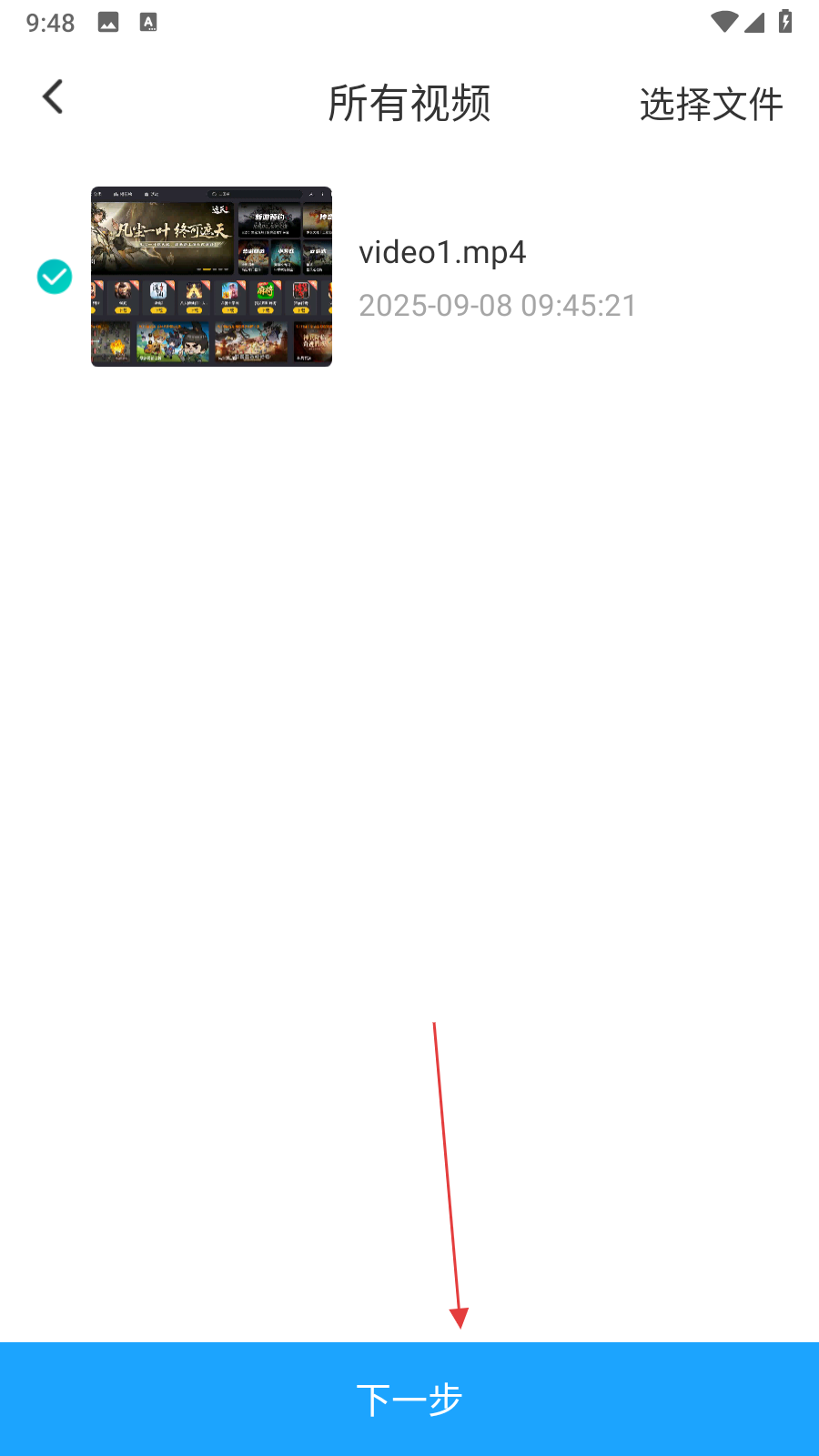 2、在所有視頻列表中,找到需要轉(zhuǎn)換的視頻文件并勾選,勾選完成后點(diǎn)擊界面底部的下一步按鈕。