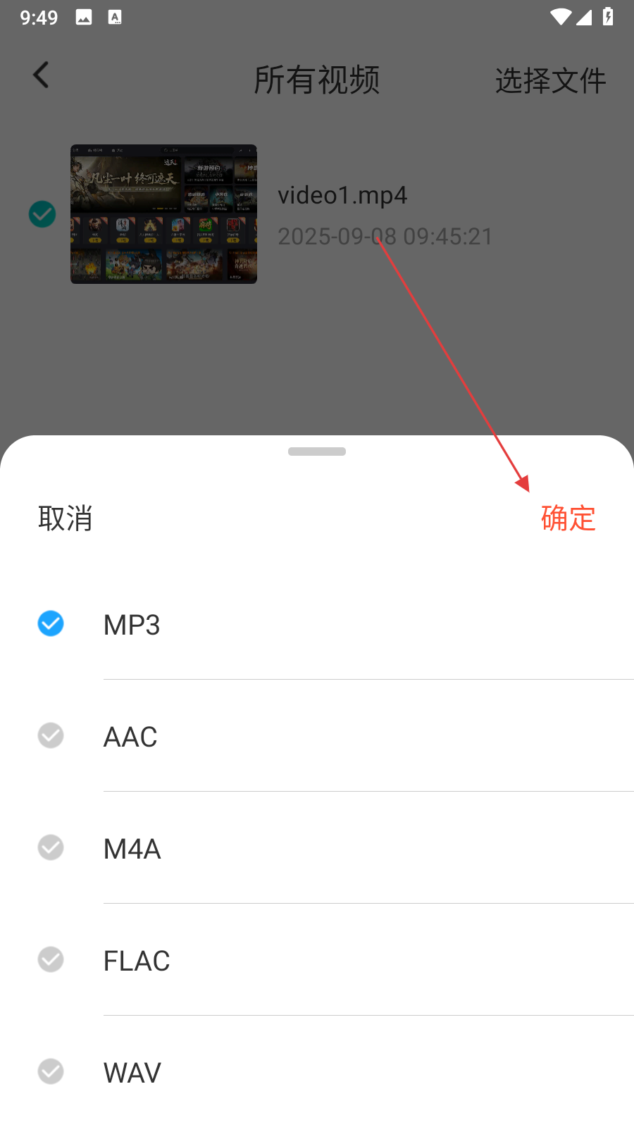 3、在彈出的音頻格式選擇列表中,選擇目標(biāo)音頻格式,然后點(diǎn)擊確定按鈕,開(kāi)始從視頻中提取音頻。