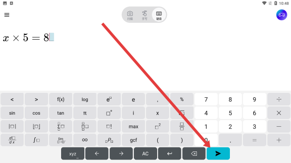 3、輸入數(shù)學(xué)公式后,點(diǎn)擊鍵盤(pán)藍(lán)色箭頭按鈕,提交獲取解題結(jié)果。