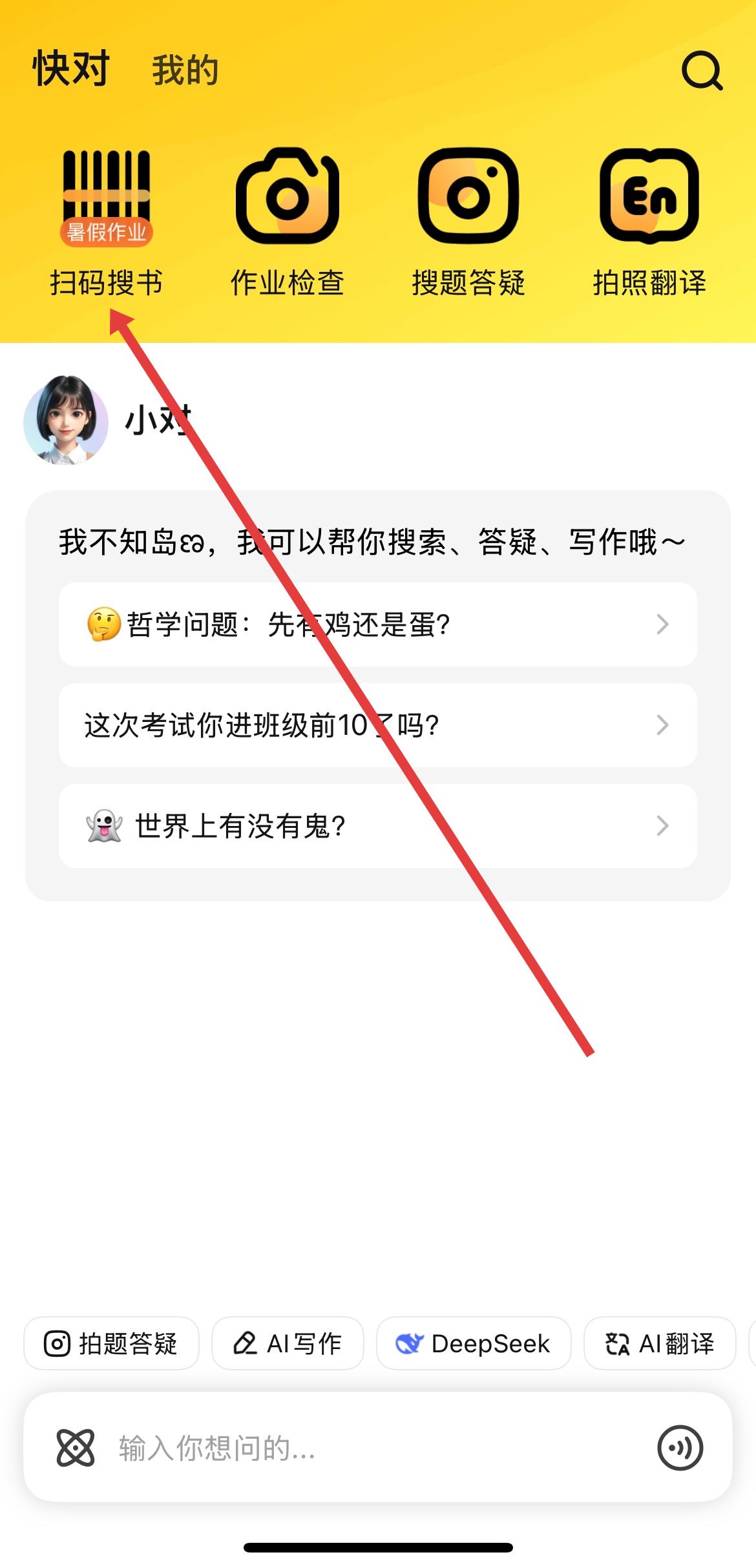 1、打開快對APP,找到快對區(qū)域的掃碼搜書功能入口點(diǎn)擊進(jìn)入,掃一掃教輔條形碼。