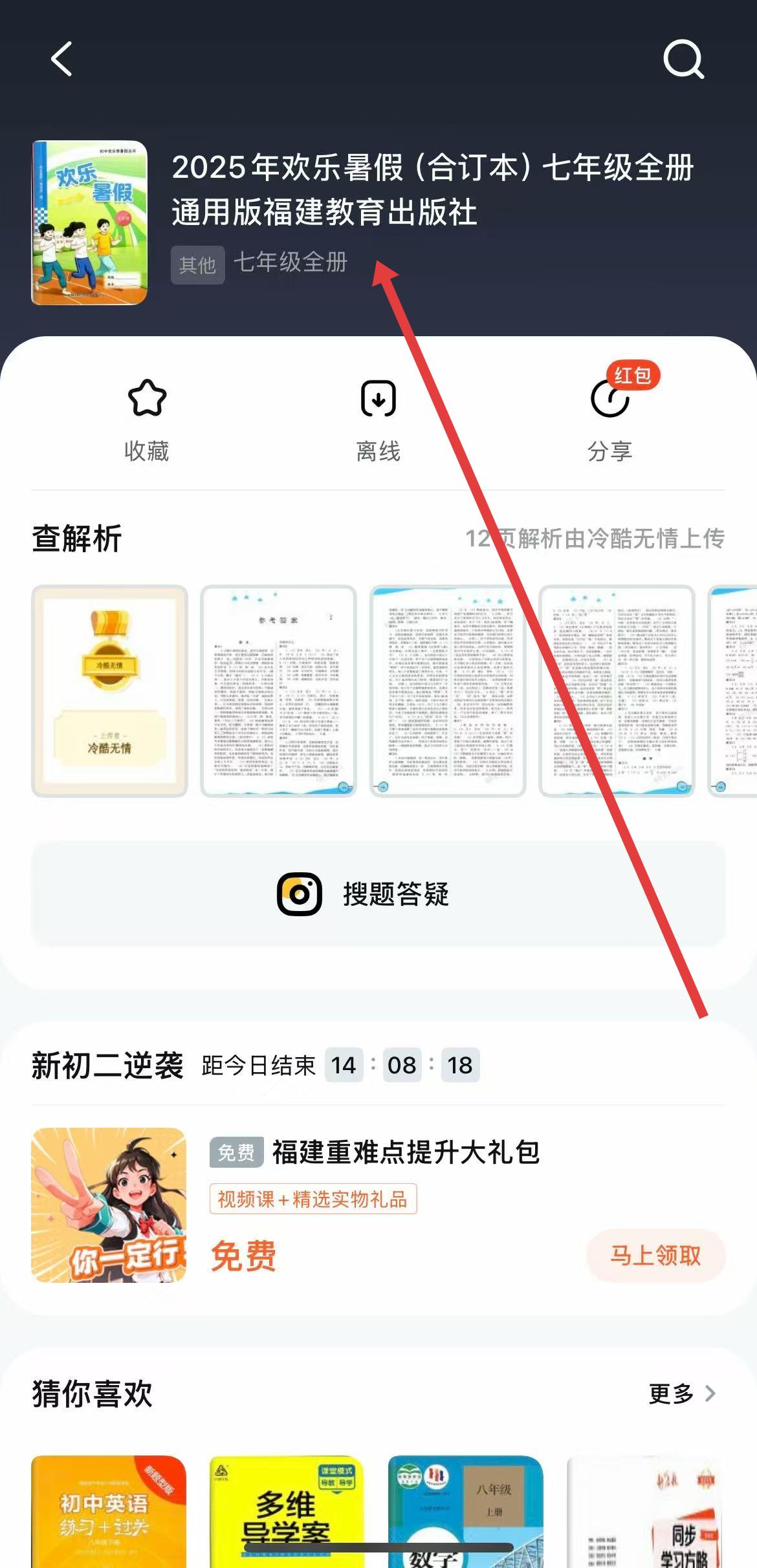 3、完成掃碼搜教輔操作之后,核對教輔名是否正確,接下來就可以查看對應(yīng)的教輔資料及解析。