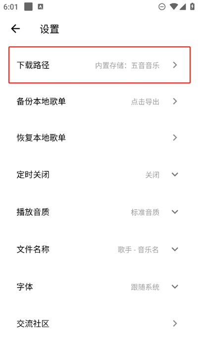 5、在設(shè)置中可以看到下載路徑,將會看到現(xiàn)在的下載音樂位置所在位置;