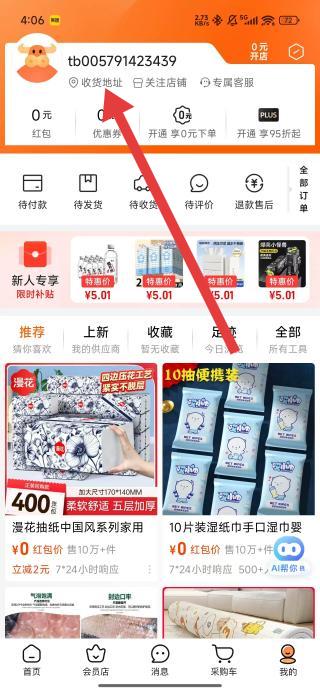 2、在個人中心頁面點(diǎn)擊收貨地址選項(xiàng),進(jìn)入收貨地址管理界面,準(zhǔn)備設(shè)置配送地址信息。