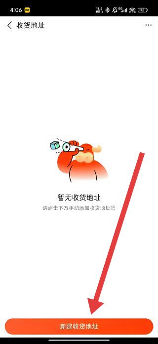 3、在收貨地址頁面,根據(jù)箭頭指向處,點(diǎn)擊底部新建收貨地址按鈕,開始添加收貨地址信息的流程。