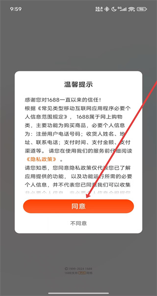 1、可以通過點(diǎn)擊溫馨提示彈窗中的同意按鈕,進(jìn)入app中開始使用。