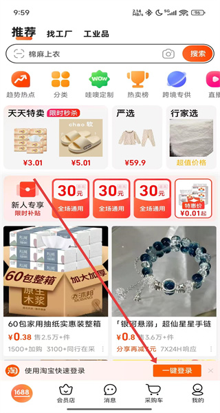 2、在進(jìn)入到1688首頁中時,可以點(diǎn)擊下方一鍵登錄按鈕,準(zhǔn)備首頁淘寶賬號進(jìn)行登錄。