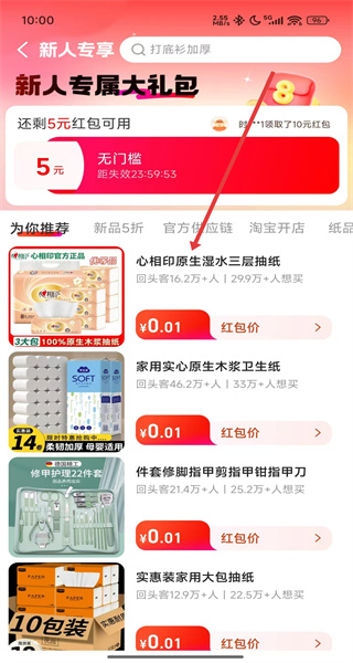4、在登錄完成后跳轉(zhuǎn)到新人專享頁面,即可點(diǎn)擊任意商品進(jìn)入查看商品詳情。