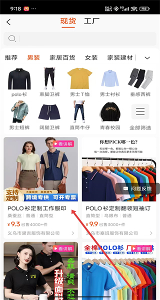 2、分類選擇界面點(diǎn)擊“男裝”,選擇目標(biāo)商品POLO衫定制工作服,點(diǎn)擊進(jìn)入商品詳情頁。