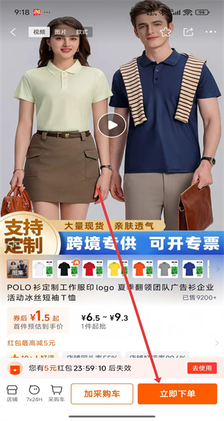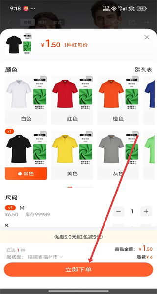 4、選擇商品顏色、尺碼后,點(diǎn)擊“立即下單”,完成商品下單流程。