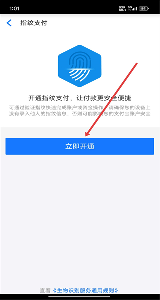 4、在指紋支付頁面點(diǎn)擊“立即開通”,完成指紋支付開通操作。