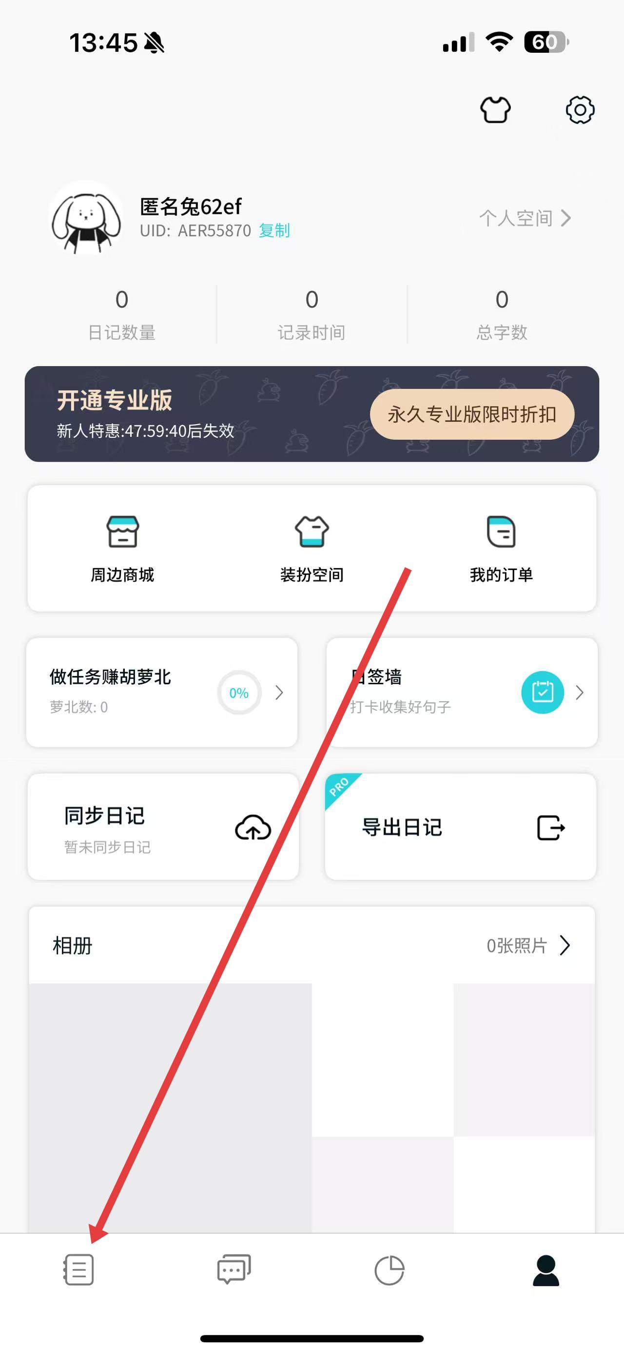 1、打開(kāi)Moo日記APP,點(diǎn)擊底部導(dǎo)航欄最左側(cè)的日記圖標(biāo),進(jìn)入日記頁(yè)面。
