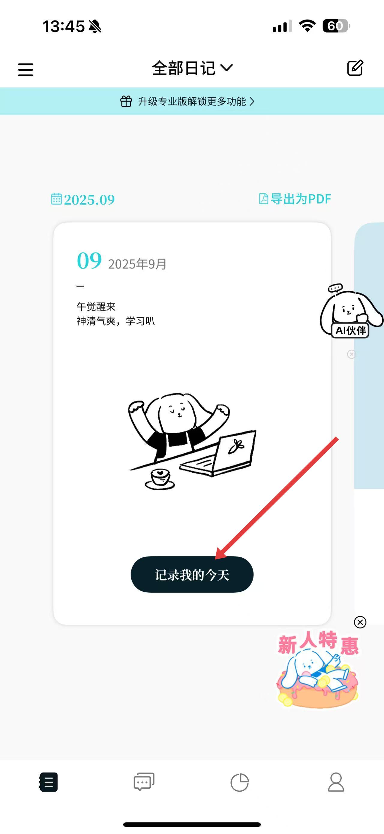 2、在日記頁(yè)面中,點(diǎn)擊記錄我的今天按鈕,進(jìn)入記錄引導(dǎo)頁(yè)面。
