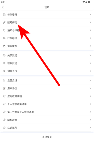 3、在設置界面中,點擊賬號綁定選項,進入賬號綁定頁面。