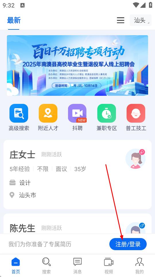 1、打開百城招聘企業(yè)版APP,在首頁點擊右下角注冊/登錄按鈕。
