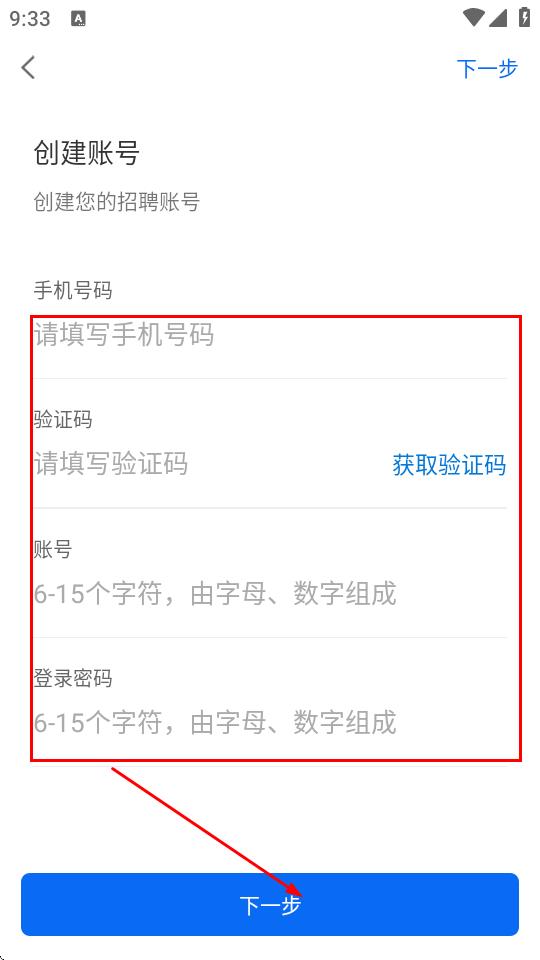 3、填寫手機號碼、填入驗證碼,設置賬號和登錄密碼,點擊下一步。