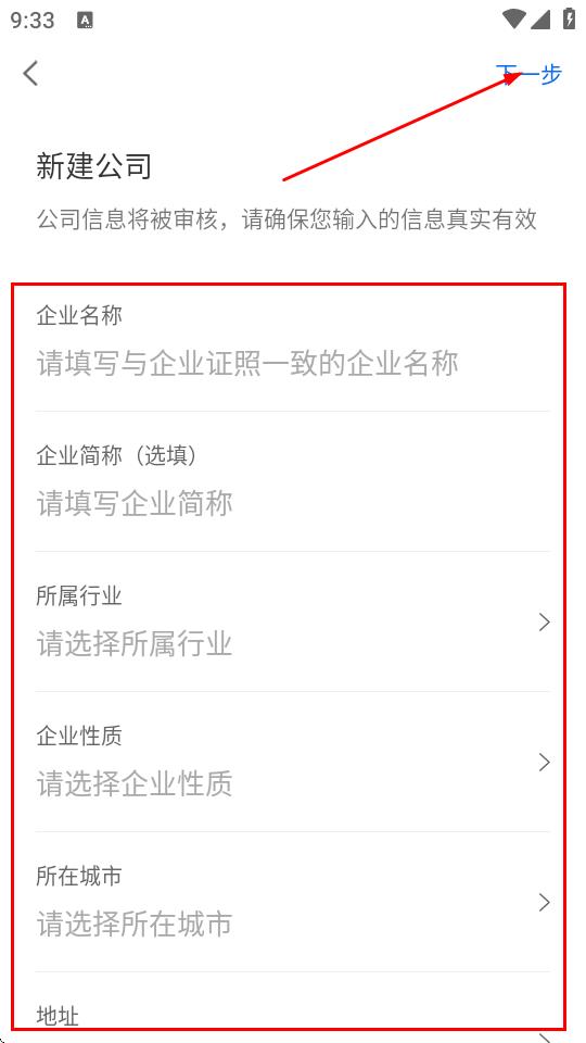 4、填寫企業(yè)名稱、企業(yè)簡稱、所屬行業(yè)、企業(yè)性質、所在城市、地址等信息,點擊下一步。