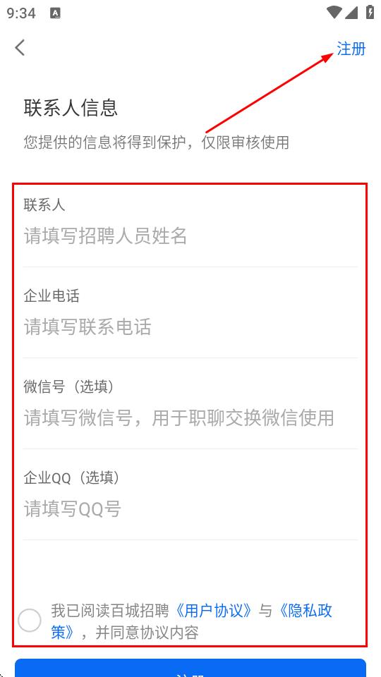 5、在聯(lián)系人信息頁面,填寫聯(lián)系人姓名、企業(yè)電話,可選擇性填寫微信號和企業(yè)QQ,勾選同意用戶協(xié)議與隱私政策,點擊注冊即可完成注冊。