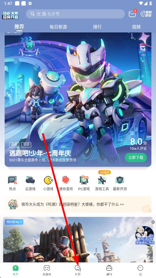 1、打開4399應(yīng)用進(jìn)入首頁,點(diǎn)擊底部社區(qū)選項(xiàng),進(jìn)入社區(qū)界面。