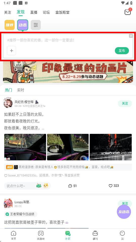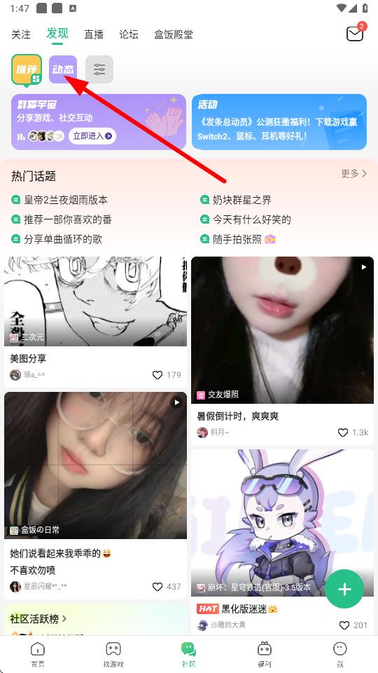 2、在社區(qū)界面中,點(diǎn)擊動態(tài)欄目,進(jìn)入動態(tài)頁面。