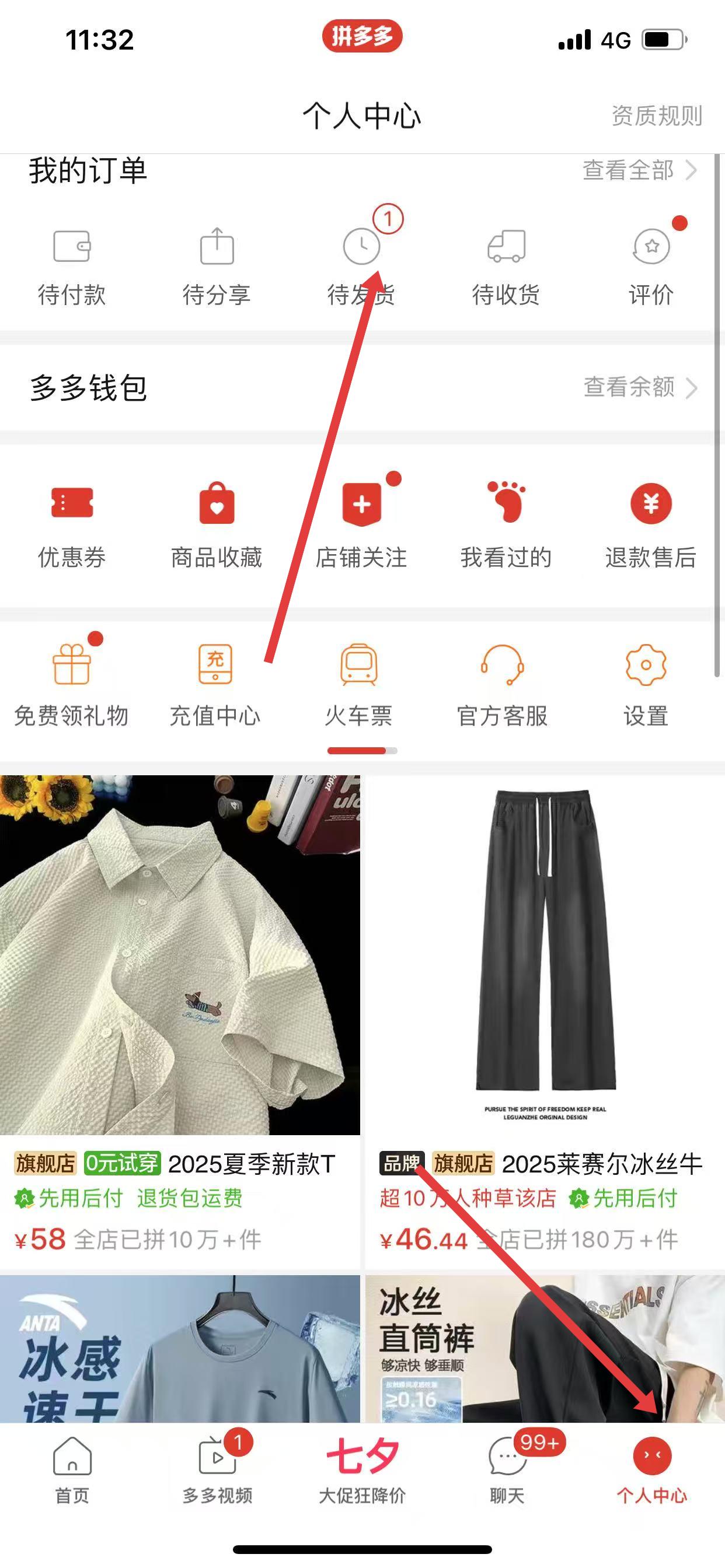 1、打開(kāi)拼多多APP,點(diǎn)擊底部導(dǎo)航欄中的個(gè)人中心,進(jìn)入個(gè)人中心頁(yè)面,在我的訂單板塊,點(diǎn)擊待發(fā)貨選項(xiàng)。