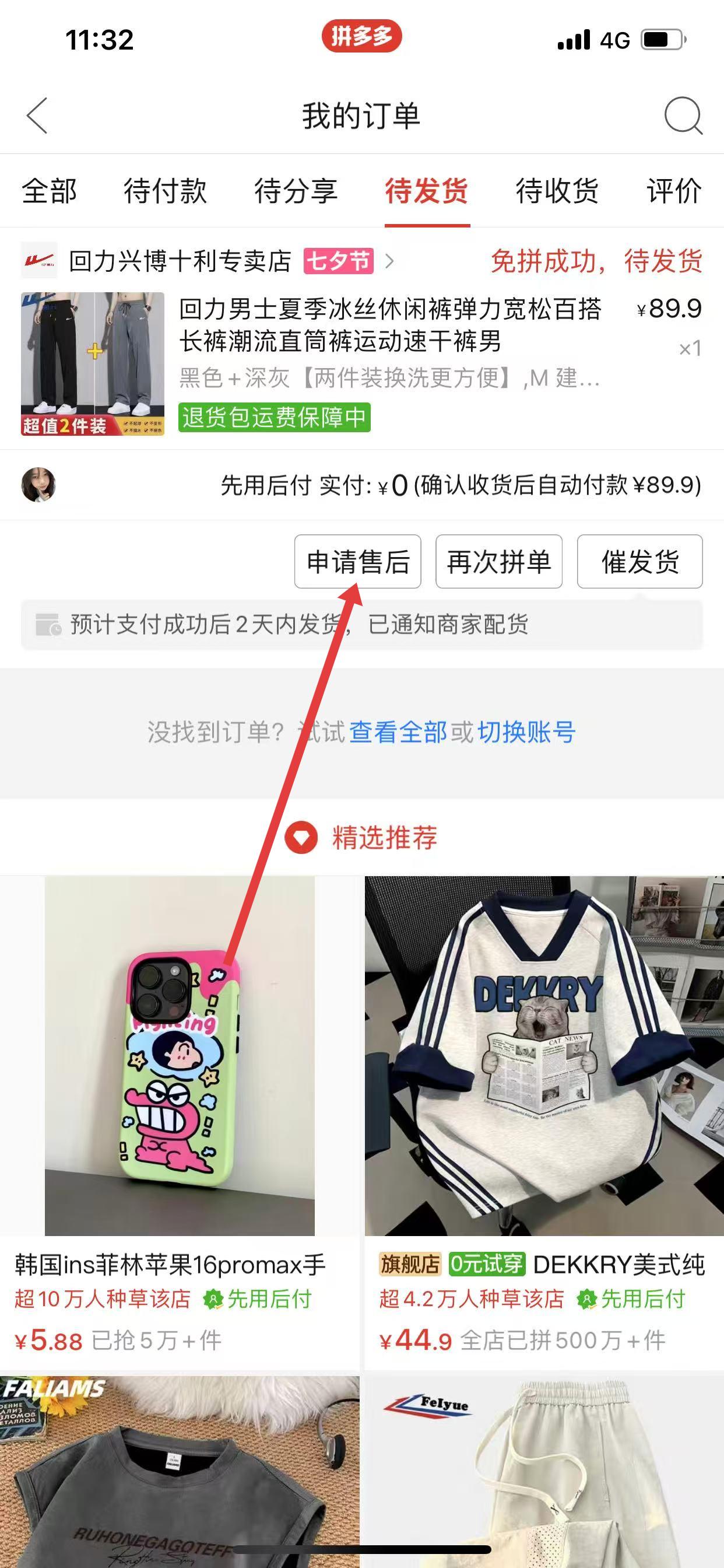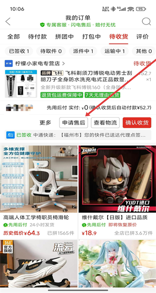 2、在待收貨訂單列表頁(yè)面找到需要退貨的訂單,點(diǎn)擊“申請(qǐng)售后”,進(jìn)入選擇售后類型頁(yè)面。