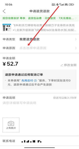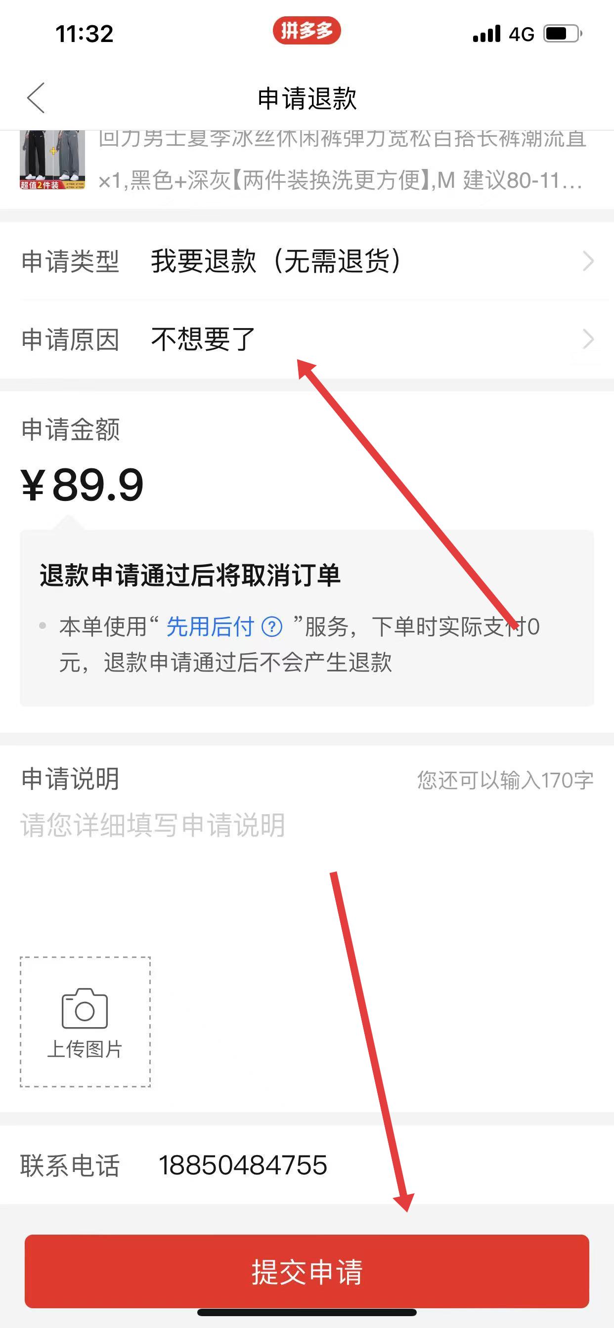 4、在申請(qǐng)退貨退款頁(yè)面選擇申請(qǐng)?jiān)颍顚懮暾?qǐng)說(shuō)明,然后提交申請(qǐng),等待商家處理即可。