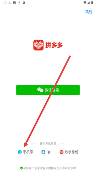 2、在拼多多登錄界面,選擇手機(jī)號(hào)登錄方式,進(jìn)入手機(jī)號(hào)輸入頁(yè)面。