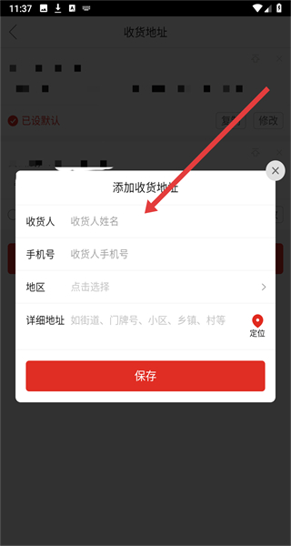 4、在編輯窗口依次輸入收貨人、手機(jī)號(hào)、地區(qū)、詳細(xì)地址,點(diǎn)擊“保存”完成收貨地址添加。