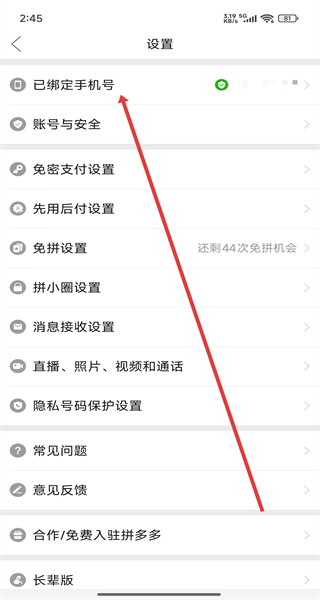 1、在拼多多設(shè)置頁(yè)面點(diǎn)擊“已綁定手機(jī)號(hào)”,進(jìn)入綁定手機(jī)號(hào)頁(yè)面。