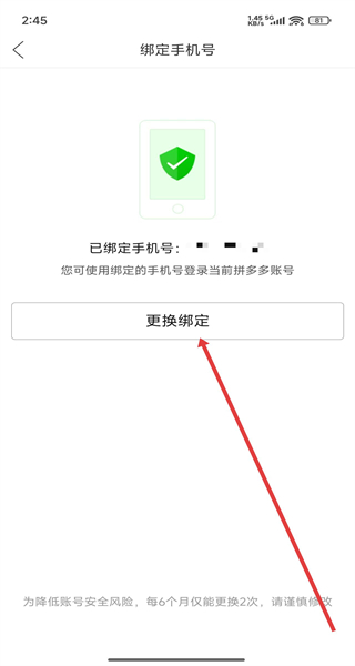 2、在綁定手機(jī)號(hào)頁(yè)面點(diǎn)擊“更換綁定”,進(jìn)入更換綁定手機(jī)號(hào)的驗(yàn)證頁(yè)面。