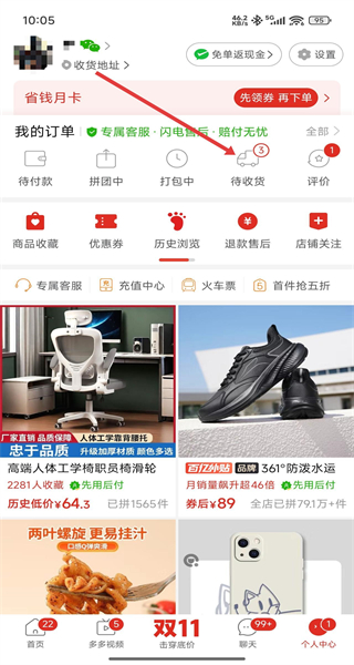 1、進(jìn)入個(gè)人中心頁(yè)面,點(diǎn)擊“待收貨”,進(jìn)入待收貨訂單列表頁(yè)面。