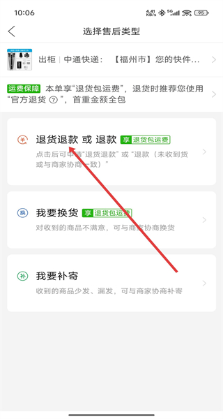 3、在選擇售后類型頁(yè)面點(diǎn)擊“退貨退款或退款”,進(jìn)入申請(qǐng)退貨退款頁(yè)面。