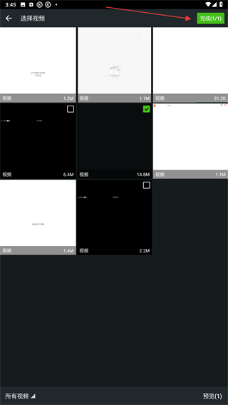 3、在選擇視頻的頁(yè)面內(nèi),選擇后點(diǎn)擊完成的按鈕。