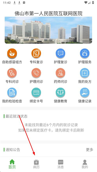 1、打開佛山市第一人民醫(yī)院互聯網醫(yī)院APP,點擊病歷。