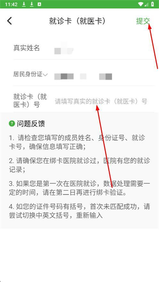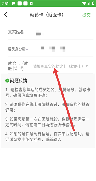 4、在就診卡信息填寫界面,就診卡號,確認信息無誤后點擊提交按鈕,完成就診卡添加操作。