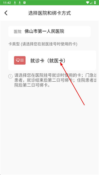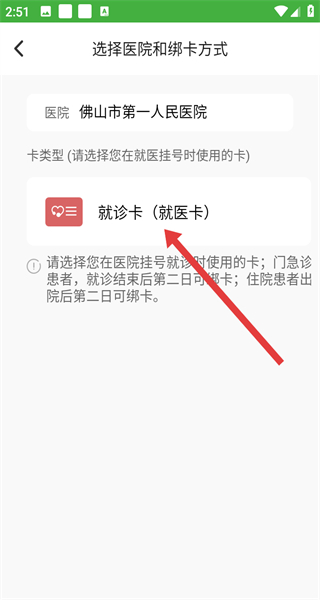 3、在選擇醫(yī)院和綁卡方式界面,選擇就診卡選項,進入就診卡信息填寫界面。