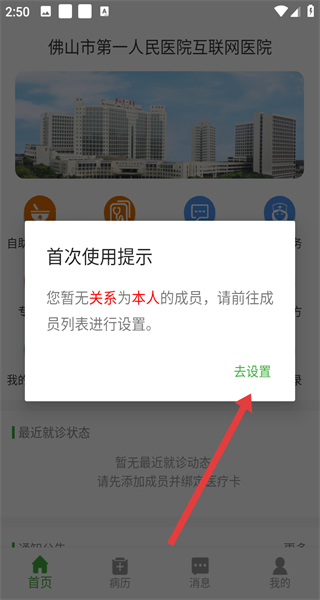 1、在佛山市第一人民醫(yī)院互聯網醫(yī)院APP首頁,點擊首次使用提示中的去設置按鈕,進入就診人列表界面。
