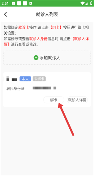 2、在就診人列表界面,點擊綁卡按鈕,進入選擇醫(yī)院和綁卡方式界面。