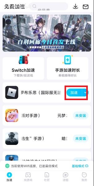 1、首先需要在手機(jī)上下載一個(gè)加速器、還有游戲安裝包,然后我們需要打開(kāi)加速器,在其中點(diǎn)擊【加速】去加速游戲;