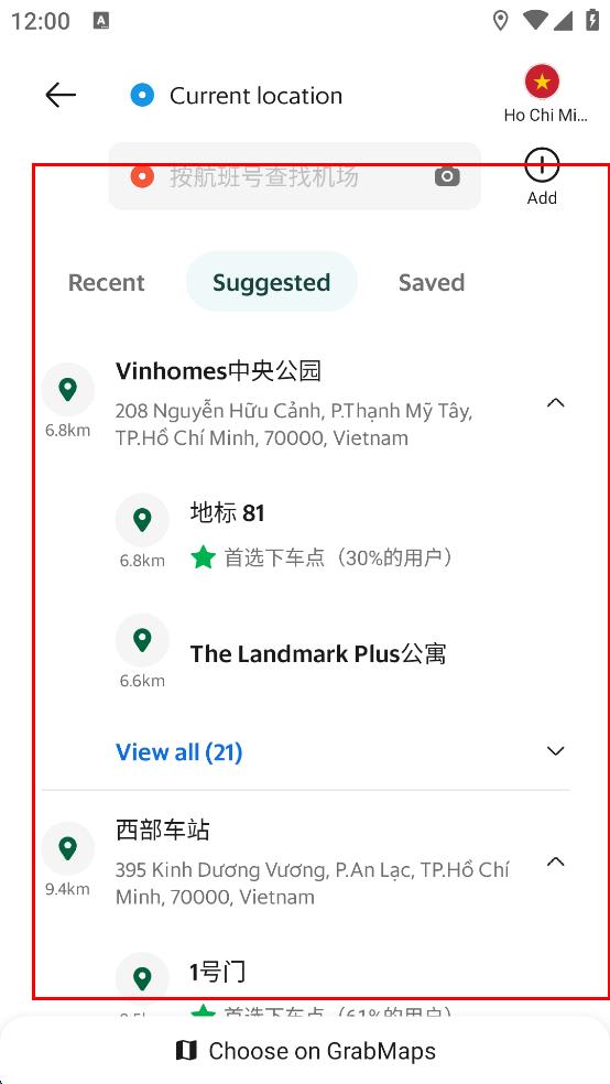 4、在目的地選擇頁面,有近期、推薦、已保存等分類,還有Vinhomes中央公園等地標(biāo)推薦,可從中選擇想要前往的目的地。