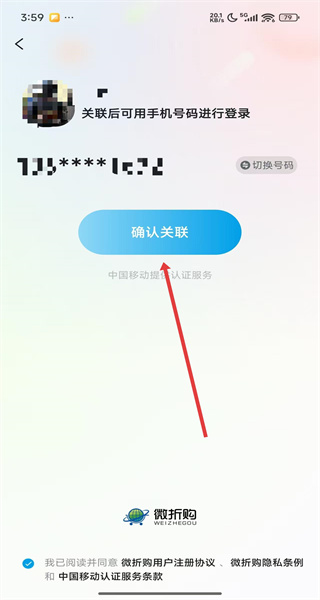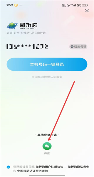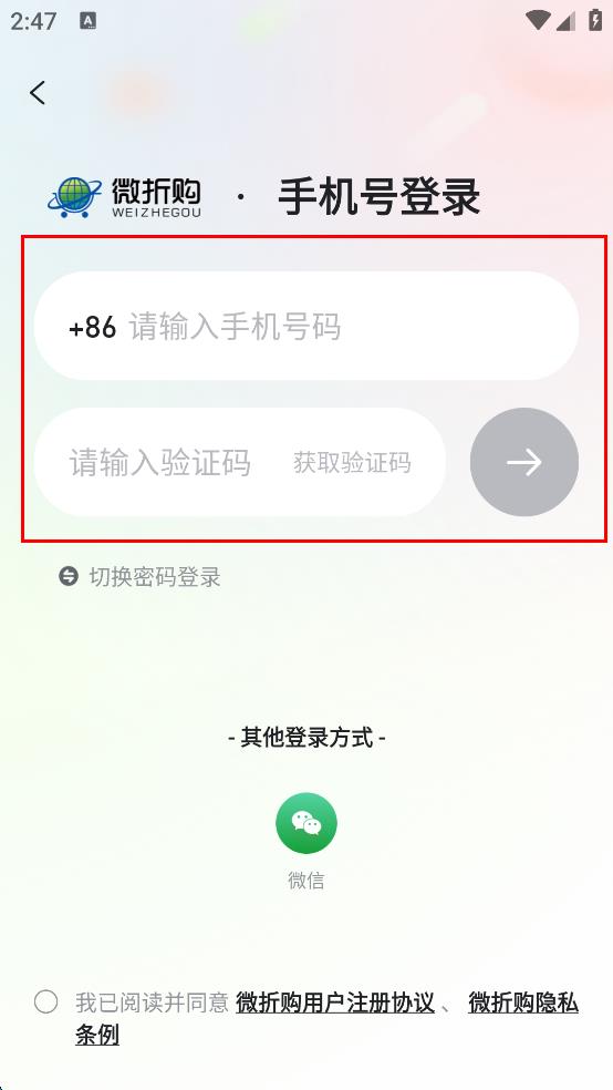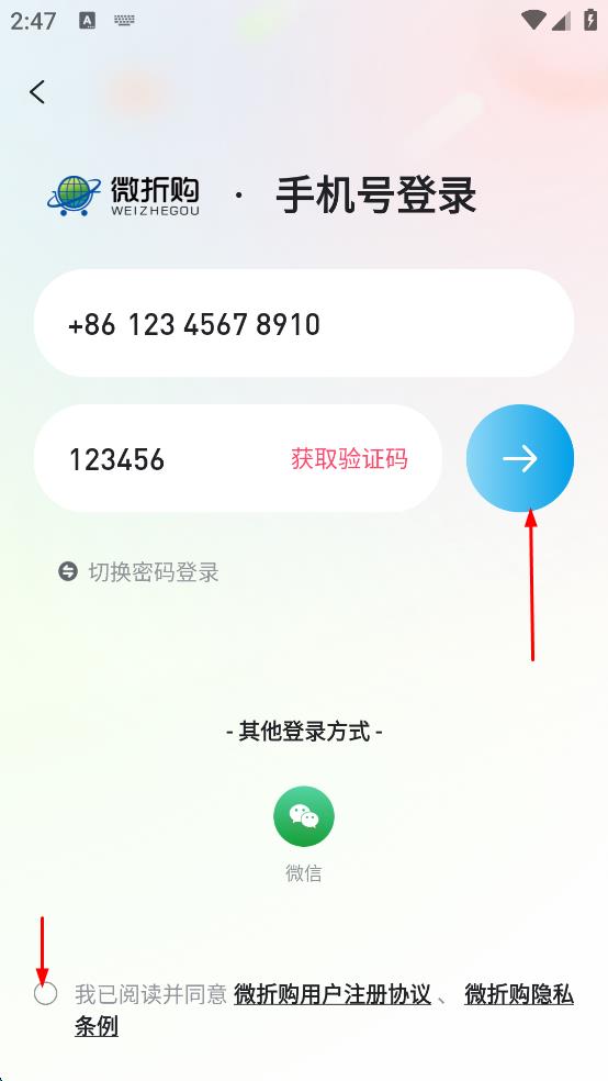 4、勾選“我已閱讀并同意微折購用戶注冊協(xié)議、微折購隱私條例”,點擊箭頭圖標(biāo),完成登錄操作。