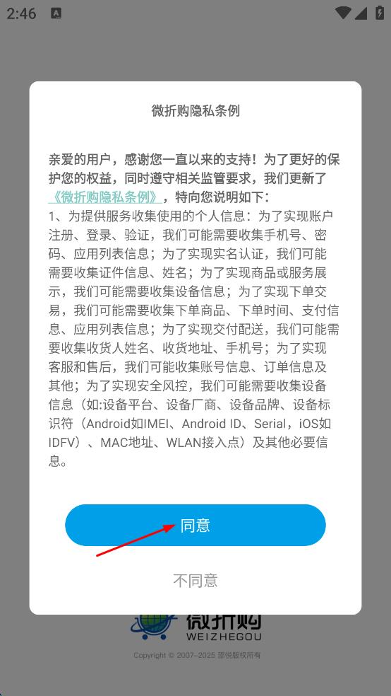 1、打開微折購APP,彈出隱私條例提示,仔細閱讀后點擊“同意”,進入APP主界面。