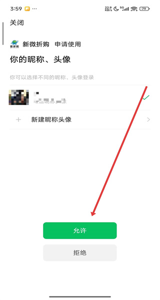 3、在微信授權(quán)頁面點擊“允許”,授權(quán)微折購使用微信昵稱和頭像。