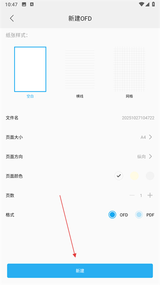 3、在新建OFD頁(yè)面,設(shè)置紙張樣式等,然后點(diǎn)擊新建按鈕。