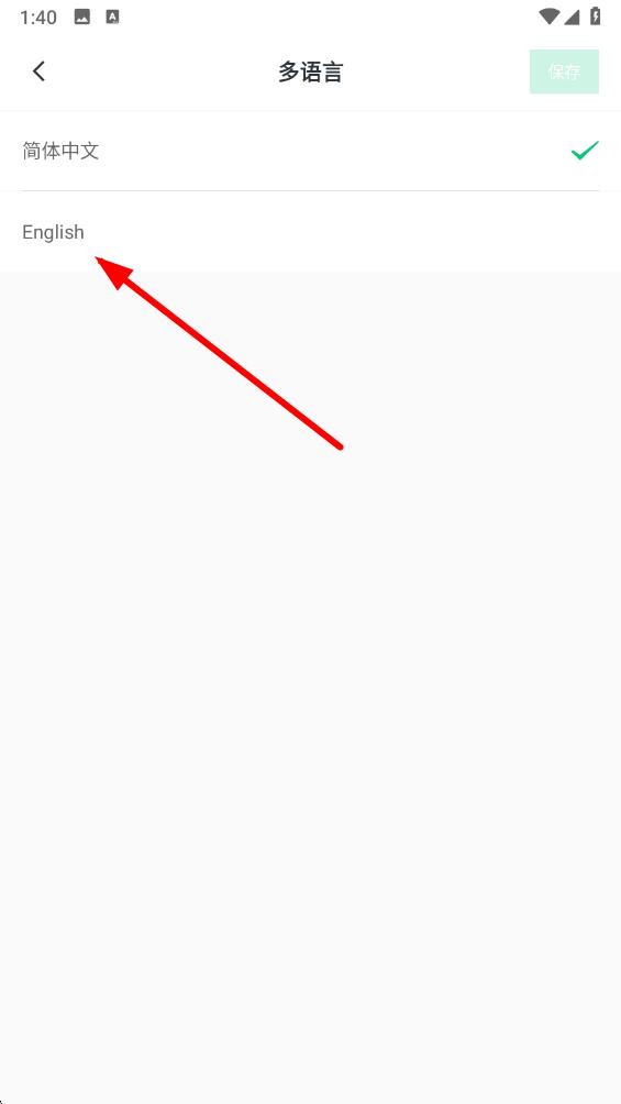 4、在語(yǔ)言選擇界面里,點(diǎn)擊English選項(xiàng),即可將哎呀音樂(lè)app切換為英文模式。
