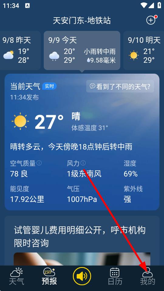 1、在天氣預報界面點擊底部導航欄最右側的我的選項。