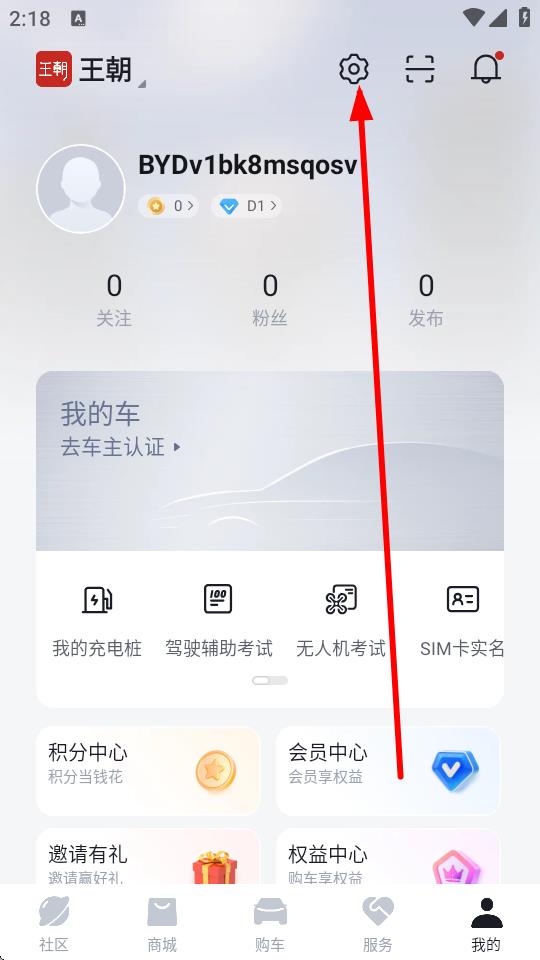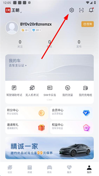 1、打開比亞迪app,在我的頁面點擊右上角設(shè)置圖標,進入設(shè)置界面。